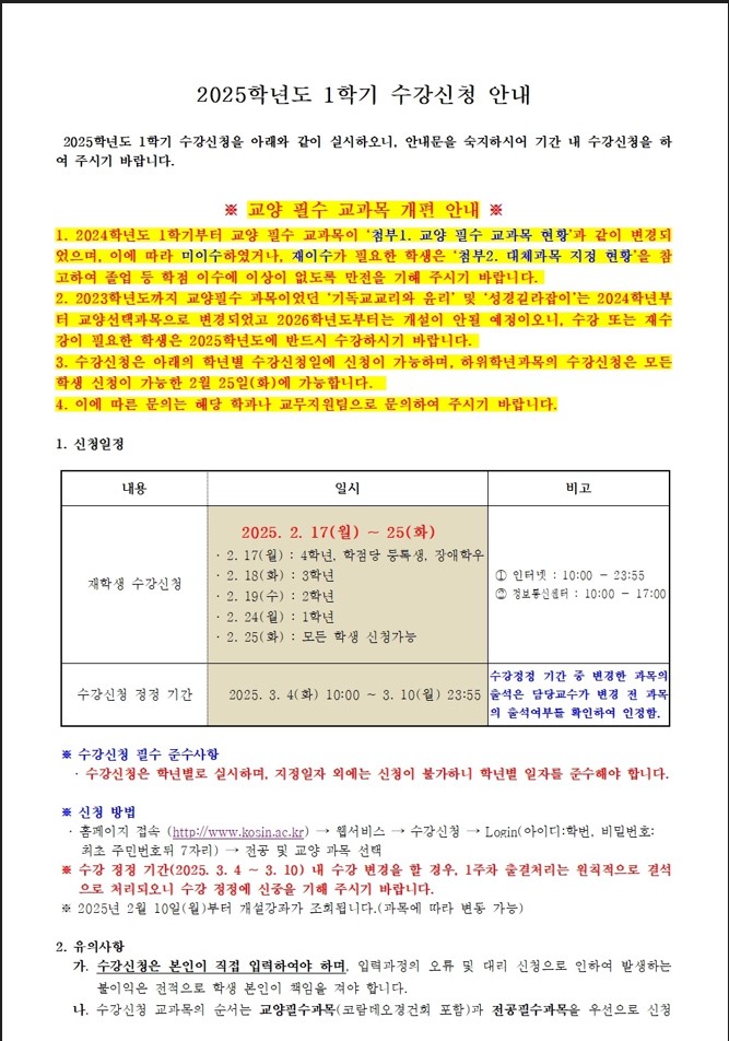 2025학년도 1학기 수강신청을 아래과 같이 실시하오니, 안내문을 숙지하시어 기간 내 수강신청을 하기 바랍니다.
