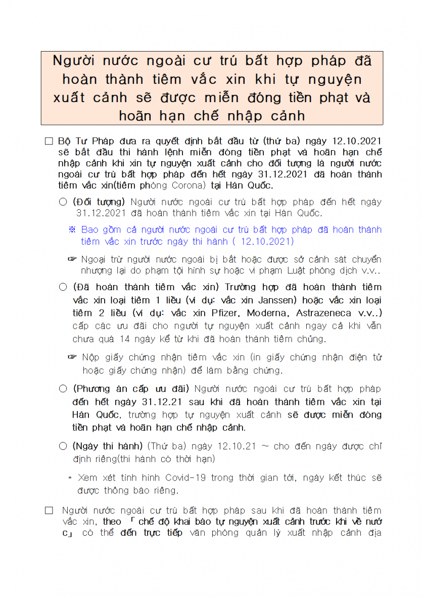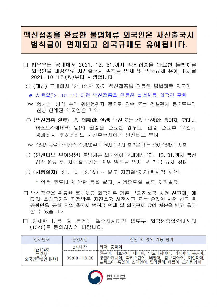 [백신 접종 불법체류 외국인 자진출국 안내문] 페이지 정보 작성자 관리자 댓글 0건 조회 4,241회 작성일 21-10-28 09:36 본문 [백신 접종 불법체류 외국인 자진출국 안내문] [이 게시물은 관리자님에 의해 2021-10-28 09:38:09 NOTICE에서 복사 됨] SNS공유 목록 이전글[불법체류 외국인 백신 인센티브 안내_법무부] 21.10.28 다음글'SNS 홍보 공모전' 수상자 안내 및 시상식 공지 21.10.22 댓글목록 댓글목록 등록된 댓글이 없습니다.