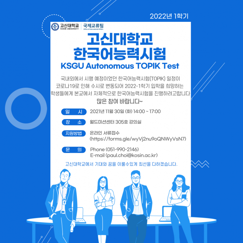 코로나19로 인해 토픽 시험 일정이 수시로 변동됨에 따라 본교에 입학하고자 하는 학생들을 위해 자체적으로 본교에서 한국어능력시험을 실시하고자 합니다. 고신대학교 입학을 희망하지만 TOPIK 3급 자격증이 없는 학생들은 본교 자체 한국어능력시험에 응시하여 3급 수준 점수를 취득하면 본교 입학이 가능합니다. 아래 일정과 링크를 참고하여 신청하여주세요.