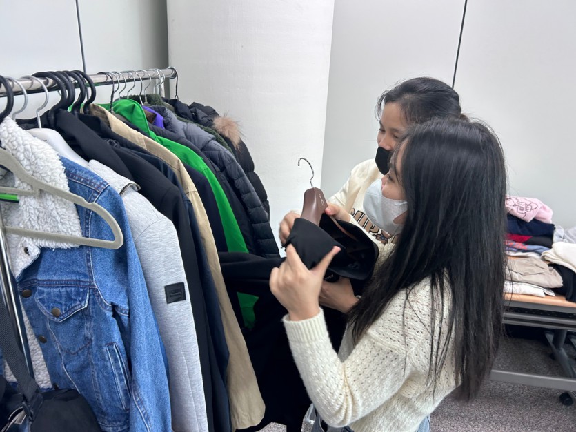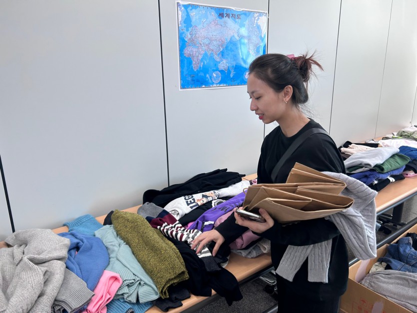 외국인유학생들은 밝은 얼굴로 추운 겨울을 따뜻하게 보낼 수 있는 겨울 의류를 고르고 서로 어울리는 옷을 골라주며 즐거운 시간을 보냈다.