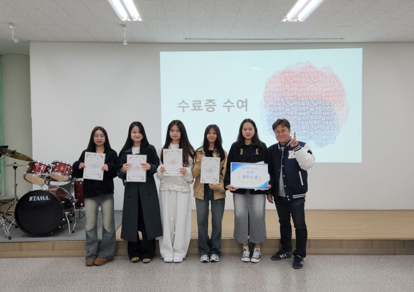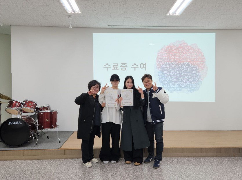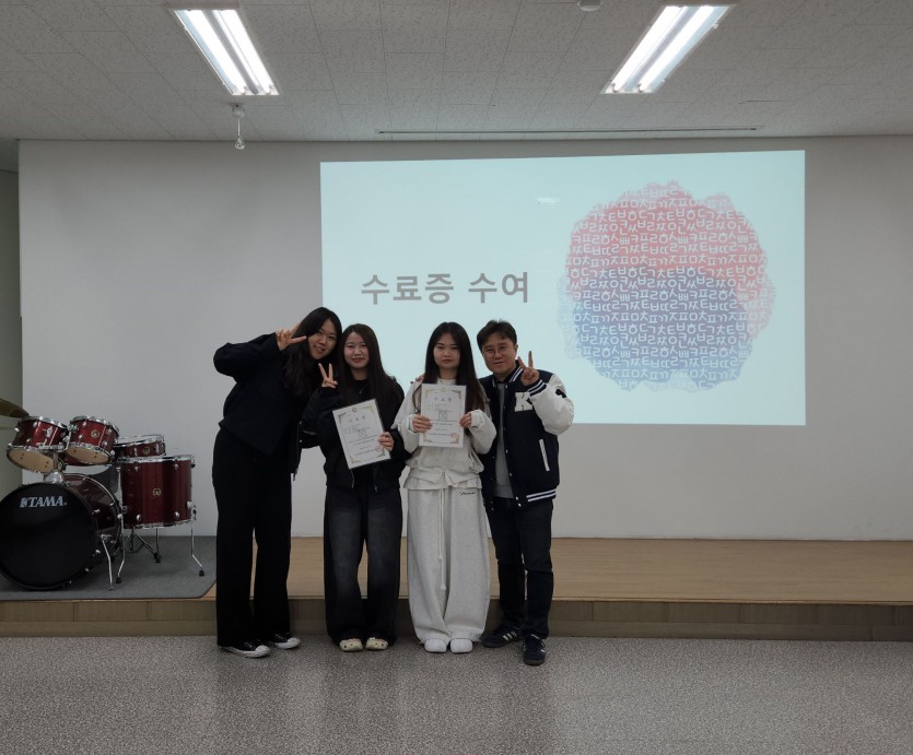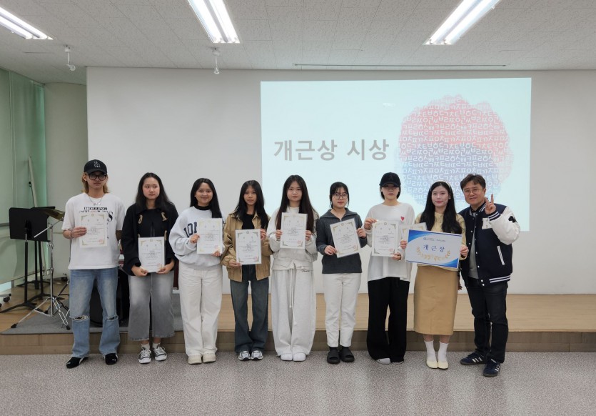 격려사를 이어 수료한 학생과 졸업한 학생에게 수료증을 전달하고 각 급수 성적우수학생 1등과 2등에게 성적우수상을 수여하였다. 그리고 2025-가을학기 수업기간 동안 한번도 지각과 결석하지 않은 학생 8명에게 개근상을 수여하였다.