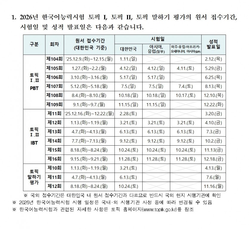 2026년 TOPIK 시험 시행 일정을 안내해 드립니다.